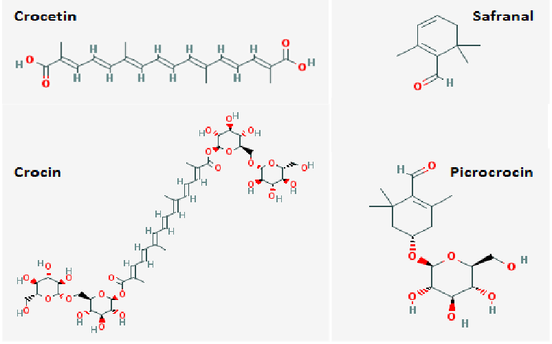 صبغة الزعفران ( Saffron)‏: يستخرج من ميسم زهرة الزعفران ويستخدم كصباغ للحرير وللطعام. ونحتاج إلى 70000-80000 ميسم زهرة الزعفران للحصول عى 1 كغ من الزعفران، والذي يحتوي على 10 غ من الكروسين وحوالي 60 غ كروستين وهو الصباغ الفعلي.