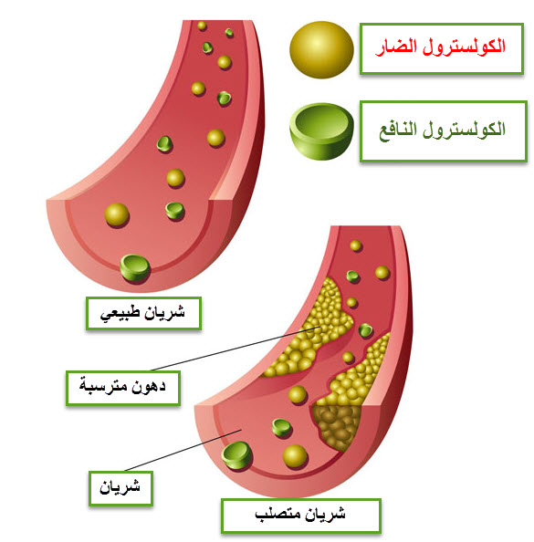 الكوليستيرول : هو مركب كيميائي عضوي يذوب في الدهن ولا يدوب في الماء يصنعه الجسم بنسبة 80% والباقي يحصل عليه من الطعام ذات المصدر الحيواني ينقل الكوليسترول من الكبد إلى باقي خلايا الجسم عن طريق بروتينات خاصّة تُدعى البروتينات الدهنيّة النّاقلة (Lipoprotines Low density :LDL ) وهو ما يسميه البعض بالكوليستسرول السيء والـ(HDL) ينقله من الدم الى الكبد ويسمى بالكوليستيرول الجيد ونتيجة لكثرة تناول الكولستيرول سيرتفع تركيزه بالدم مع الدهون الاخرى التي تذيبه فيسبب امراض عدة منها الضغط وتصلب الشرايين.