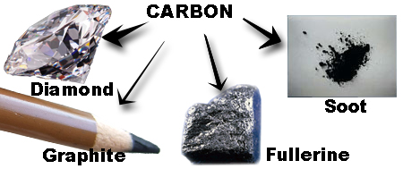 الماس والكرافيت في قلم الرصاص والفحم والسخام وهنالك اشكال كثيرة مختلفة لعنصر واحد وهو الكاربون تختلف اشكاله بأختلاف الضروف البيئية التي تمر عليه فصلابة الماس جعلت منه اداة تستخدم لقطع بعض المواد كالزجاج والكرافيت المادة اللينة المنزلقة استغلت في مواد التشحيم والتزييت لمفاصل الاليات الكبيرة اما الفحم فمعروف منذ القدم بأستخدامه كمصدر للطاقة واخيرا السخام الناتج عن احتراق بعض المواد العضوية فيعتبر مادة ليست ذا فائدة تذكر