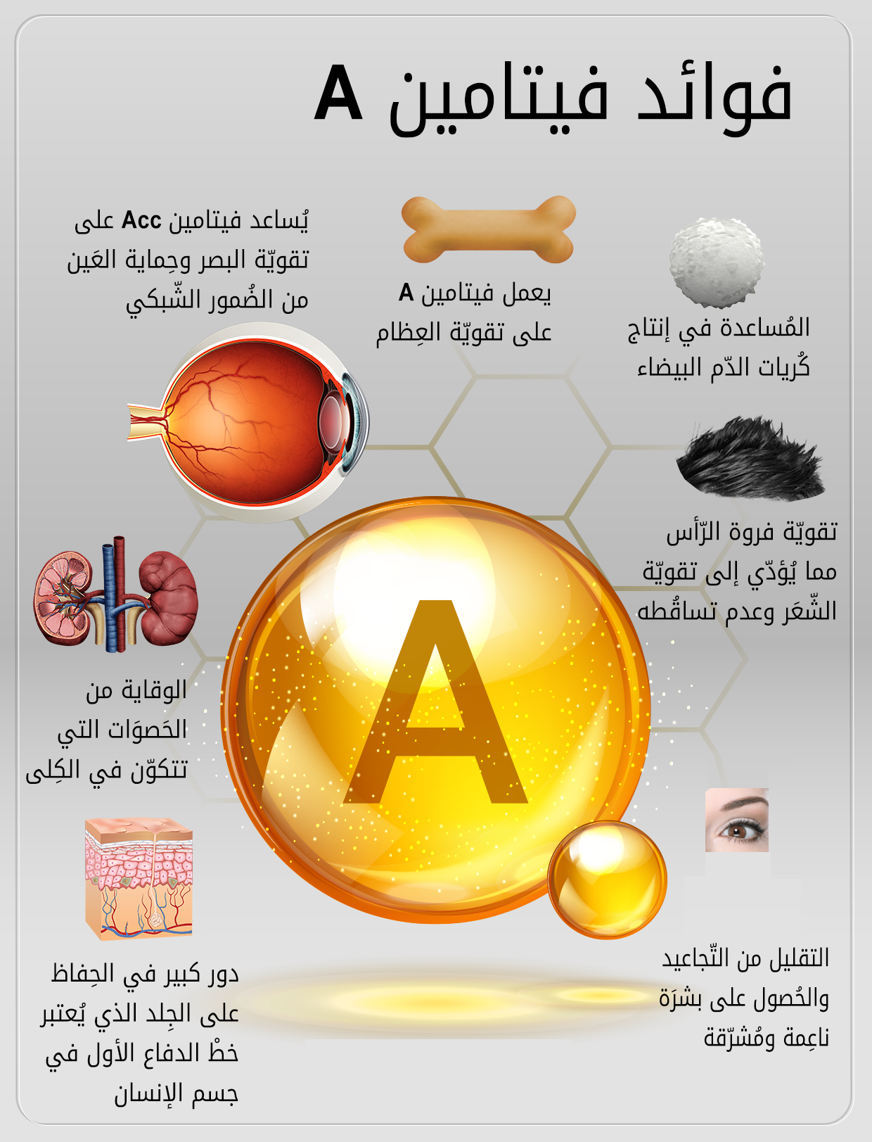 فيتامين أ (Vitamin A) : هو من الفيتامين الذائبة في الدهن (لاتذوب في الماء) له اهمية كبيرة جدا كمضاد اكسدة للحفاظ على صحة القلب والجهاز التنفسي والكلى بالاضافة الى اعظاء اخرى من الجسم. لكي تعرف فوائد مادة ما عليك اولا ان تعرف ماذا يسبب نقصها اولا فنقص فيتامين أ يسبب مشاكل عديدة منها تأخر الانجاب وضعف الخصوبة وضعف اوفقدان البصر والعشو وجفاف العينين والبشرة وقلة مناعة الجسم بحيث يصاب الشخص بعدوى الجهاز التنفسي والبطن وكذلك تأخر نمو الاطفال.