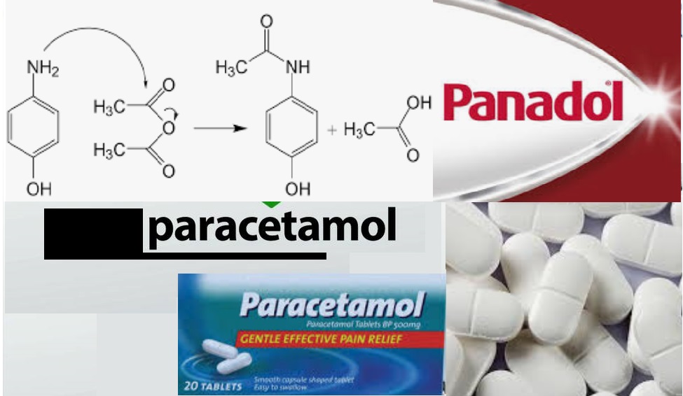 اسم مشتق من مركب مركب (N-acetyl-p-amino-phenol ) واسماء اخرى باندول وأدول وغيرها الكثير : يحضر من تفاعل مركب بارا امينو فينول و انهدريد حامض الخليك او حمض الخليك المركز (الخل) بخلط هذه المكونات بتركيز مناسب لكل منهما مع الماء المقطر في دورق تفاعل عند درجة حرارة 60 م وبعد فترة من التحريك والتسخين يوقف التفاعل ويبرد فتفصل بلورات الباراسيتامول وتنقى وتطحن و تخلط مع مواد مالئة وترسل الى معامل تصنيع الدواء للتغليف والتعبئة. وهو مادة تستعمل كمضاد الآلام كالصداع، مضاد…