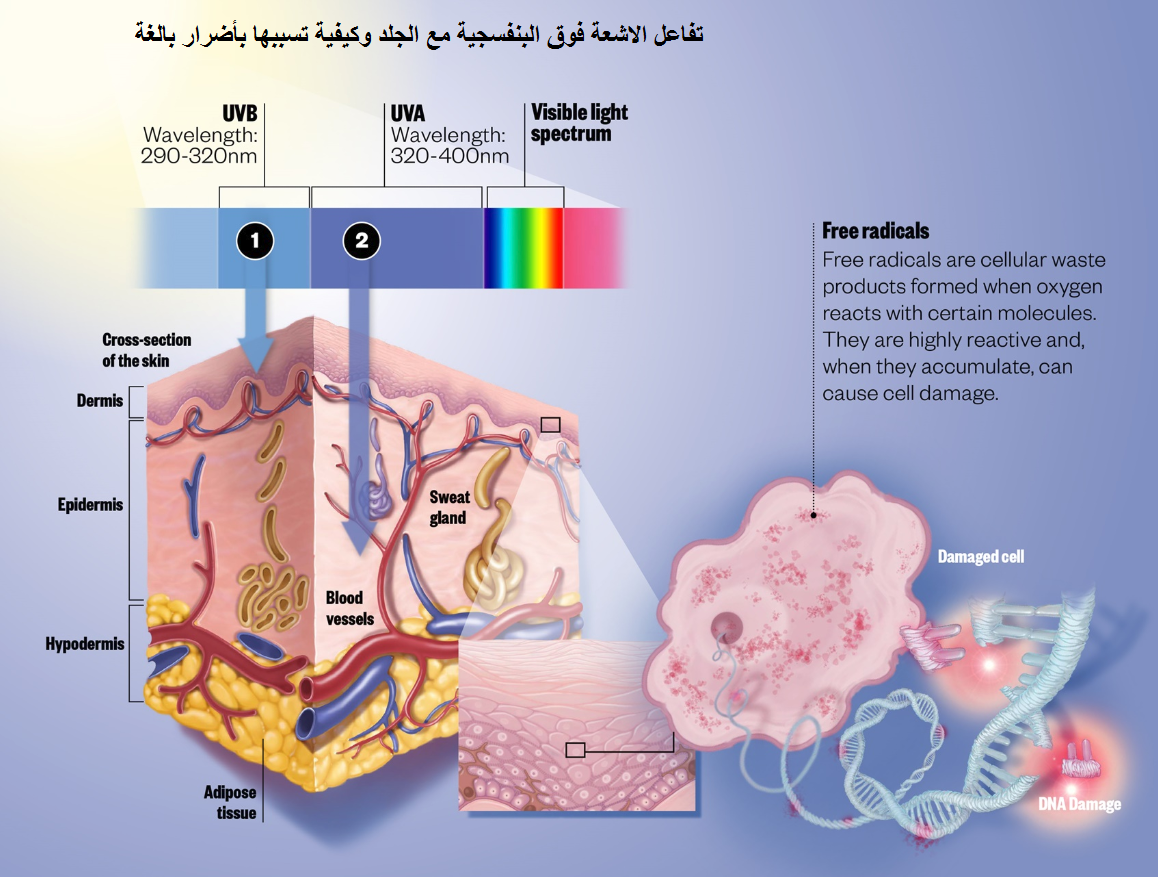 كريم الواقي الشمسي يتكون من مادة اساس تعمل كوسط حامل او مذيب للمواد الكيميائية وكثيرا مايستخدم الكلسيرول والفازلين لهذا الغرض اما المواد الفعالة فهي عبارة عن مركبات كيميائية تقوم ببعثرة او عكس نسبة كبيرة من الاشعة فوق البنفسجية القادمة من الشمس ومن نفاذها للجلد ومن هذه المواد ثنائي اوكسيد التيتانيوم واوكسيد الزنك تدعى الجسيمات النانوية Nano particles ويوجد على علبة الواقي الشمسي رقم الـ SPF وهو مختصر لكلمة عامل الحماية من الشمس (Sun Protection Factor) يختلف الرقم حسب طبيعة البشرة والطقس.