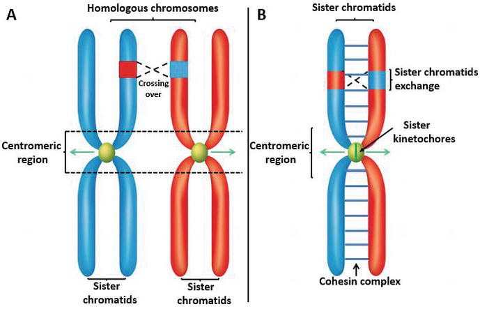 هي عملية تحدث في مرحلة S من دورة الخلية حيث يتكون الكروموسوم من كروماتيدين شقيقين متطابقين وقد يتم تبادل مقاطع من الـDNA بينهما نتيجة إصلاح تلفه خاصة عند حدوث كسور أو أخطاء أثناء التضاعف وغالباً عبر إعادة التركيب المتماثل. يعد هذا التبادل طبيعياً بمعدل منخفض ولا يسبب تغيراً ملحوظاً لأنه بين نسخ متطابقة لكن ارتفاعه يدل على عدم استقرار جيني أو التعرض لعوامل ضارة لذا يستخدم لتقييم سلامة الـDNA ودراسة الطفرات والعوامل المسرطنة.