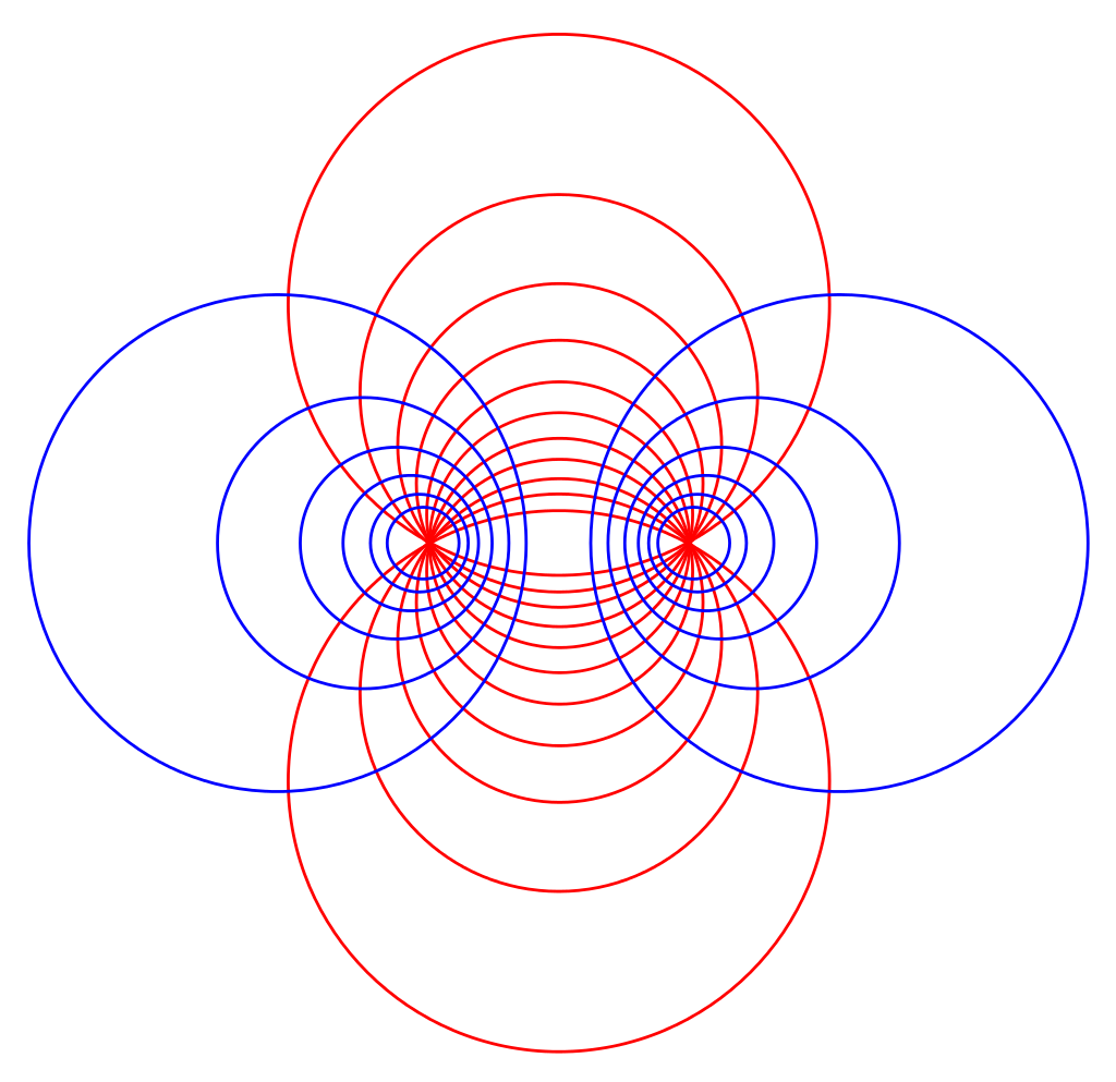 الدوائر الأبولونية، كل دائرة زرقاء تتقاطع مع كل دائرة حمراء بزاوية قائمة، والعكس صحيح