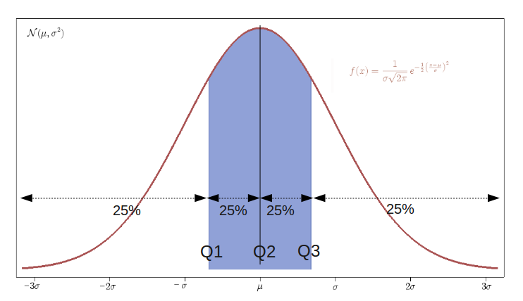 ثلاث نقاط تجزيء لدالة الكثافة الاحتمالية لتوزع احتمالي طبيعي. تقسم هذه النقاط التوزيع إلى أربع مجالات متساوية الاحتمال. يطلق على نقاط التجزيء الخاصة هذه اسم الرُّبَيعات (الربيع الأولQ1، الربيع الثاني Q2، والربيع الثالث Q3)