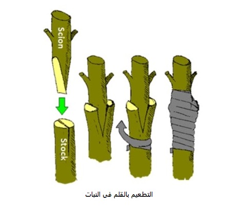 ثانيا: التطعيم بالقلم: وهو نوع من التطعيم يجرى وقت سكون العصارة في غراس المشتل والأشجار الكبيرة وهناك أشجار يصعب تطعيمها بالعين ومثال على ذلك العنب .