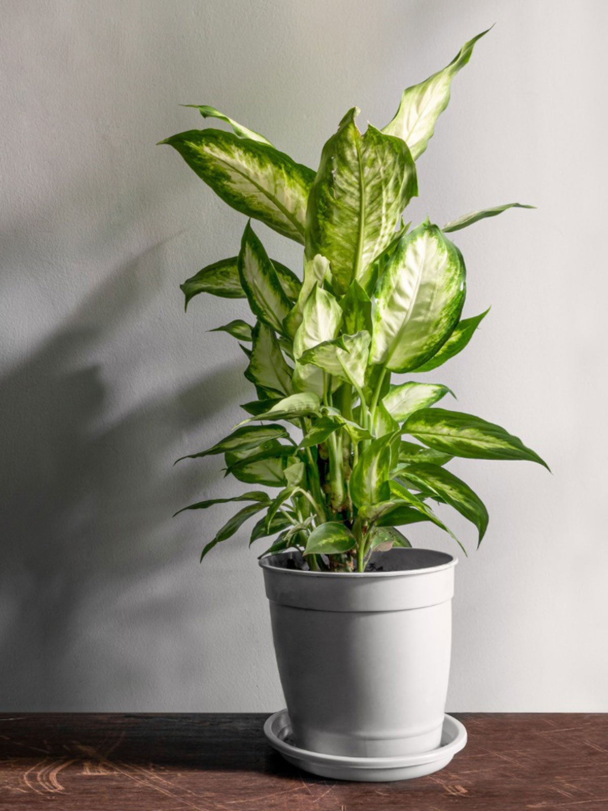 نبات قائم ساقة سميكة، ذو اوراق كبيرة الحجم مبرقشه باللون الذهبي او الابيض او الكريمي.