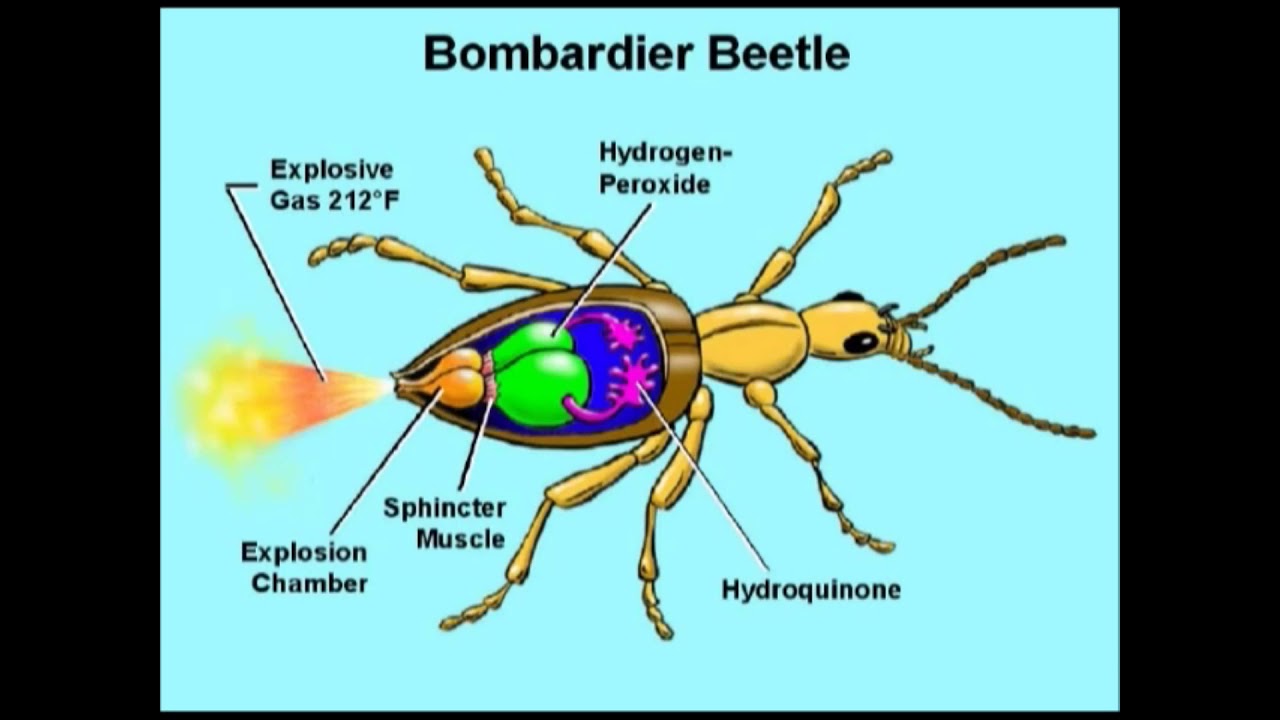 الخنفساء المدفعية Bombardier Beetle أو المستر بي بي Mr. B. B كما يصفها بعض العلماء من فرط ذهولهم أمامها!! وهي عبارة عن حشرة صغيرة طولها 3.5 سم، هذه الحشرة عندما تقف في موقف الخطر من أحد أعدائها تطلق غاز متفجر من نهاية بطنها بسرعة كبيرة جدا ودرجة حرارة حارقة (100 مئوية)، وهذا الغاز مزيج مادتين كيميائيتين (مادة بيروكسيد الهيدروجين hydrogen peroxide ومادة الهيدروكينون hydroquinone) حيث يقبع كل منهما في مكان خاص في بطنها ولكن عند الخطر تقوم بمزجهم معا في غرفة خاصة مع بعض الماء..