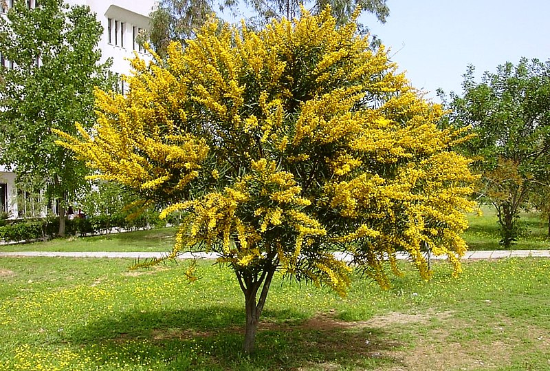 شجرة الأكاسيا سيانوفيللا Acacia cyanophylla مستديمة الخضرة موطنها الأصلي سواحل استراليا الغربية، تنتمي للفصيلة القرنية Leguminoideae، تحت الفصيلة الطلحية Mimosoideae يصل ارتفاعها إلى حوالي 5م، ذات أفرع متهدلة، وتزهر نهاية شهر مارس وبداية شهر أبريل، وأزهارها صفراء جميلة جداً، نموها سريع، ومقاومة للجفاف وزحف الرمال.