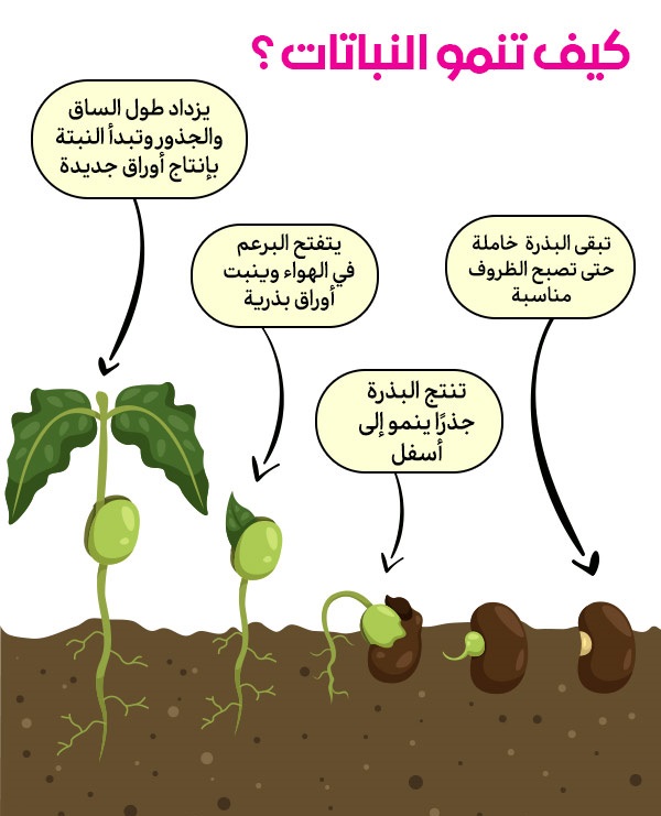 * النمو: تتفتح براعم النبتة في الهواء وتنبت أوراق بذرية.