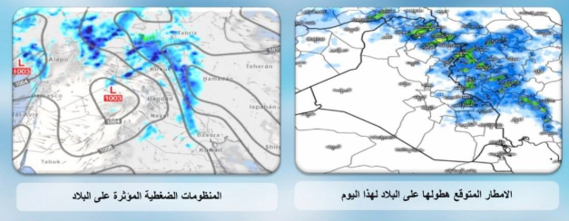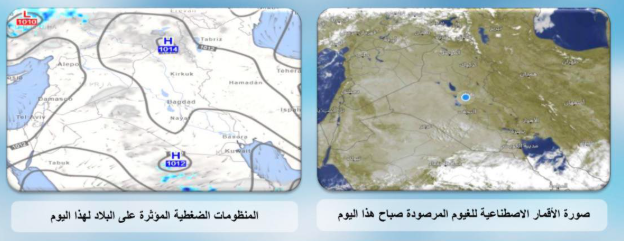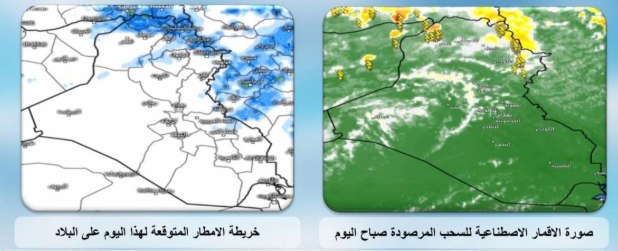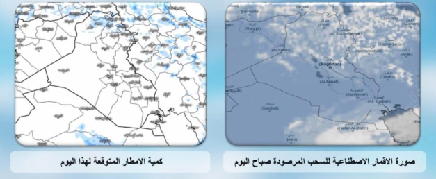 تستمر حالة عدم الاستقرار الجوي بتأثيرها على أجواء البلاد ليكون الطقس في المنطقة الوسطى والأقسام الغربية للبلاد صحواً إلى غائم جزئياً، في حين يكون الطقس غائماً جزئياً إلى غائم أحياناً في المنطقتين الشمالية والجنوبية مع فرص واردة لتساقط زخات مطر خفيفة الى معتدلة الشدة رعدية أحيانا تتركز في المنطقة الشمالية والاقسام الشرقية للبلاد مع فترات من الغزارة في بعض الأماكن مع هطول زخات مطر خفيفة في أماكن متفرقة محدودة من المنطقتين الوسطى والجنوبية.