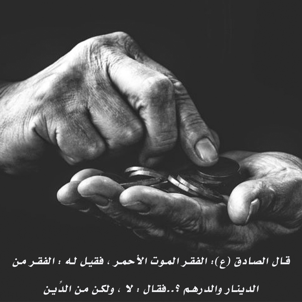 قال الصادق (ع): الفقر الموت الأحمر ، فقيل له : الفقر من الدينار والدرهم ؟..فقال : لا ، ولكن من الدِّين