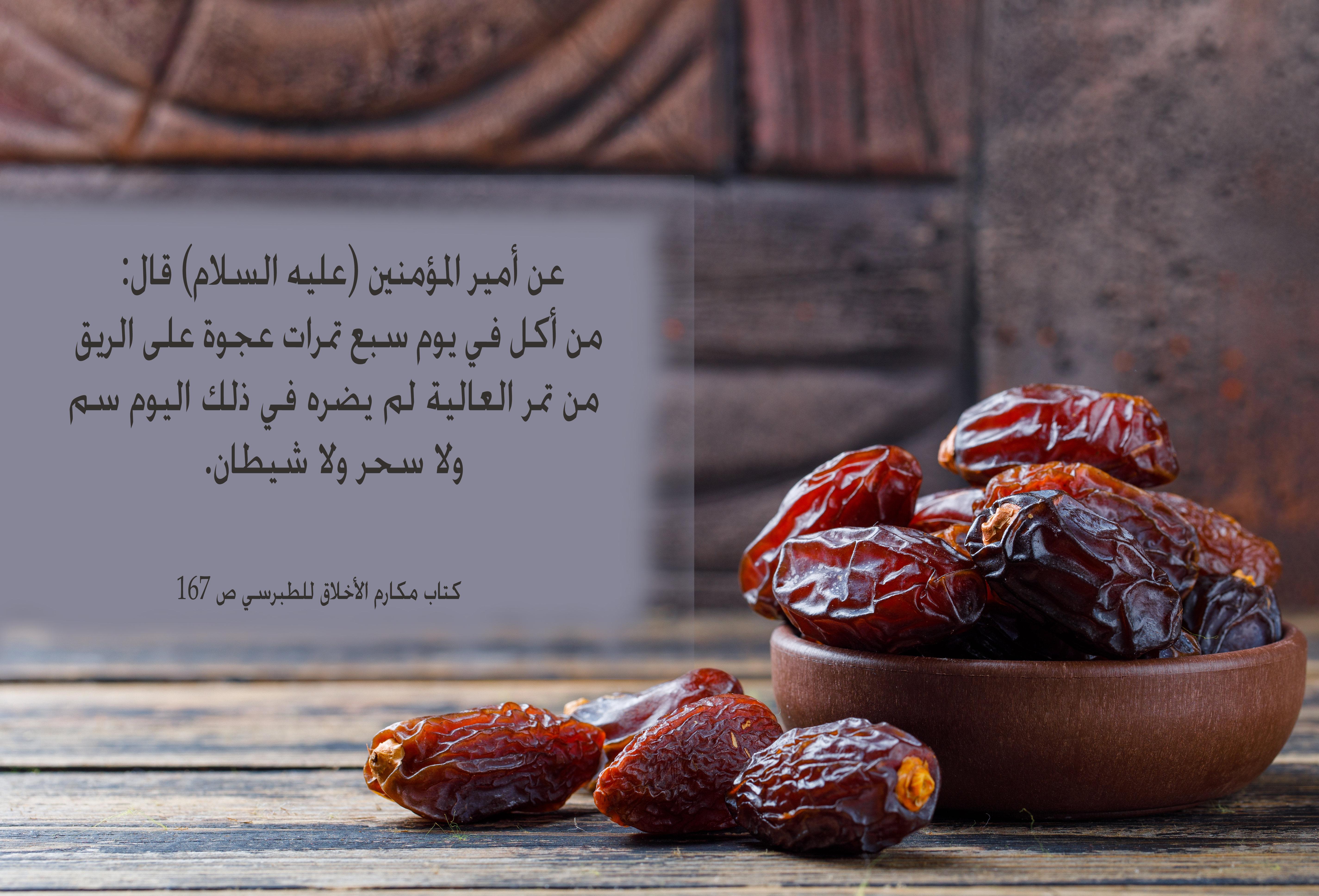 عن أمير المؤمنين(عليه السلام) قال: من أكل في يوم سبع تمرات عجوة على الريق من تمر العالية لم يضره في ذلك اليوم سم ولا سحر ولا شيطان.