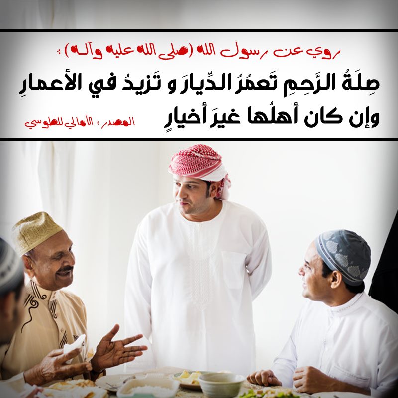 روي عن رسول الله ( صلى الله عليه و آله ) أنهُ قَالَ : صِلَةُ الرَّحِمِ تَعمُرُ الدِّيارَ ، و تَزيدُ في الأعمارِ و إن كان أهلُها غيرَ أخيارٍ .