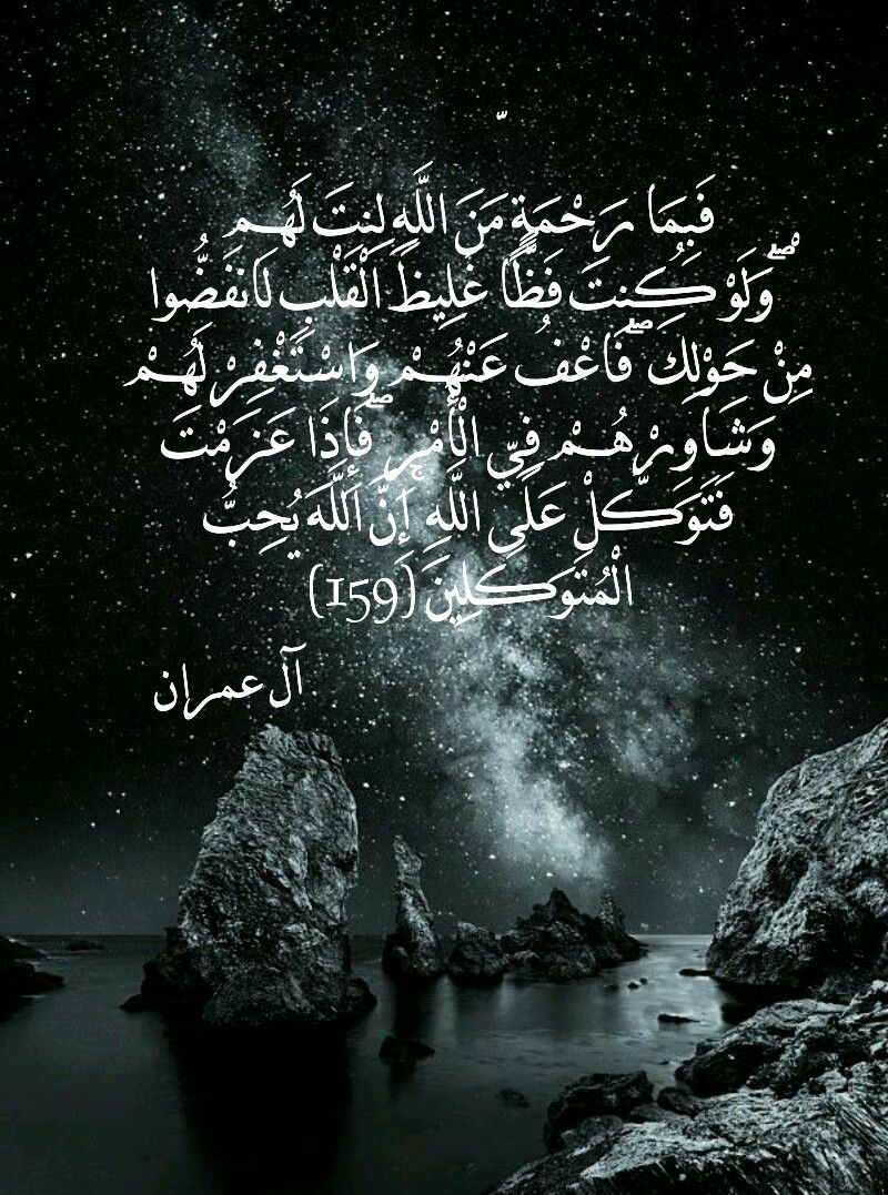 فَبِمَا رَحْمَةٍ مِّنَ اللَّهِ لِنتَ لَهُمْ ۖ وَلَوْ كُنتَ فَظًّا غَلِيظَ الْقَلْبِ لَانفَضُّوا مِنْ حَوْلِكَ ۖ فَاعْفُ عَنْهُمْ وَاسْتَغْفِرْ لَهُمْ وَشَاوِرْهُمْ فِي الْأَمْرِ ۖ فَإِذَا عَزَمْتَ فَتَوَكَّلْ عَلَى اللَّهِ ۚ إِنَّ اللَّهَ يُحِبُّ الْمُتَوَكِّلِينَ