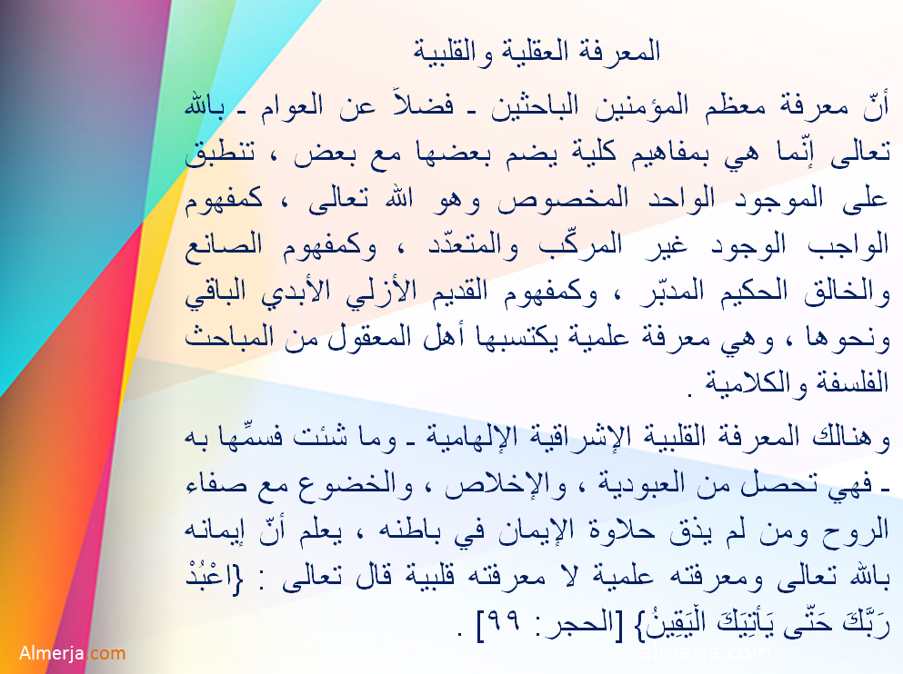 وهنالك المعرفة القلبية الإشراقية الإلهامية ـ وما شئت فسمِّها به ـ فهي تحصل من العبودية ، والإخلاص ، والخضوع…