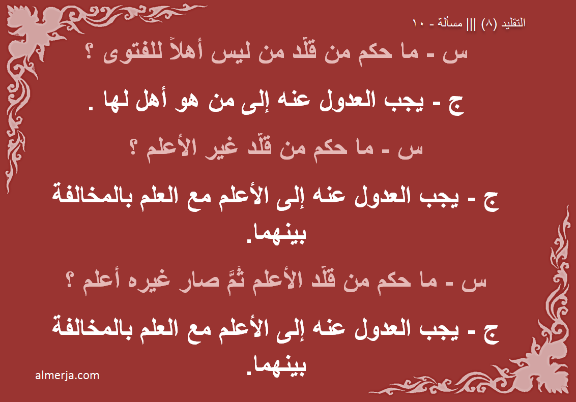 س - ما حكم من قلّد الأعلم ثُمَّ صار غيره أعلم ؟