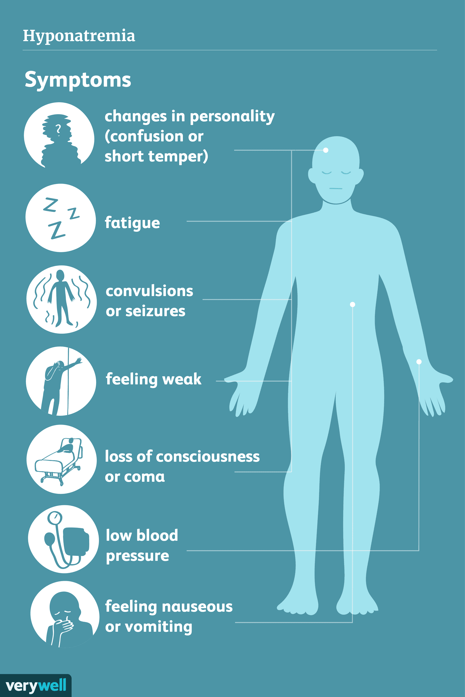 The excess total body water dilutes blood sodium levels, which can cause symptoms like confusion, nausea, seizures, and muscle spasms. Hyponatremia is usually only seen in ill people whose kidneys are not functioning properly or under conditions of extreme heat stress or prolonged strenuous exercise where the body cannot excrete the extra water. Very physically active people such as triathletes and marathon runners are at risk for this condition as they tend to drink large amounts of water.
