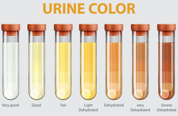 The amount and color of urine can provide a rough estimate of adequate hydration. Generally the color of urine darkens the more concentrated it is (meaning that it contains less water).