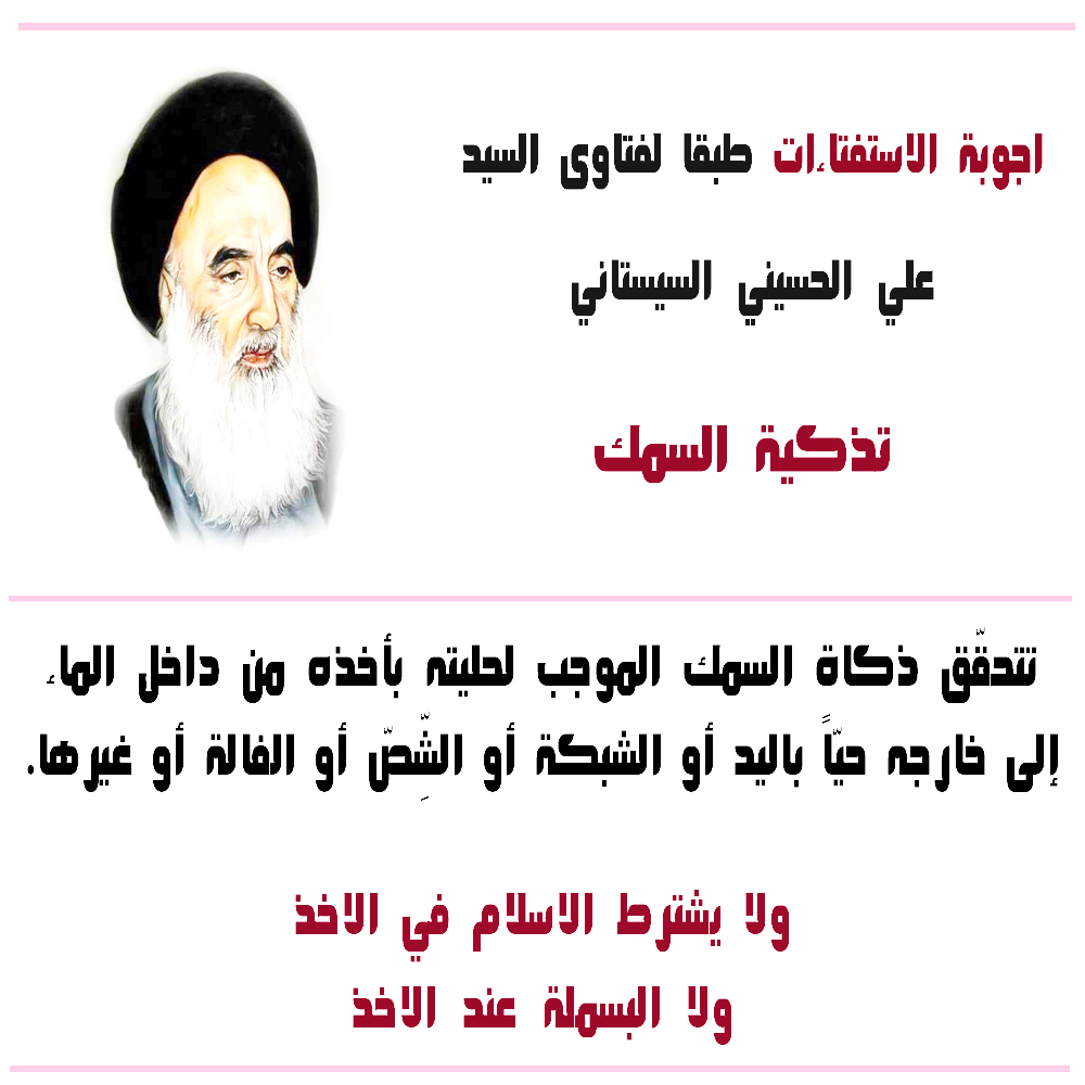 تذكيةالسمك : تتحقّق ذكاة السمك الموجب لحليته بأخذه من داخل الماء إلى خارجه حيّاً باليد أو الشبكة أو الشِّصّ أو الفالة أو غيرها.