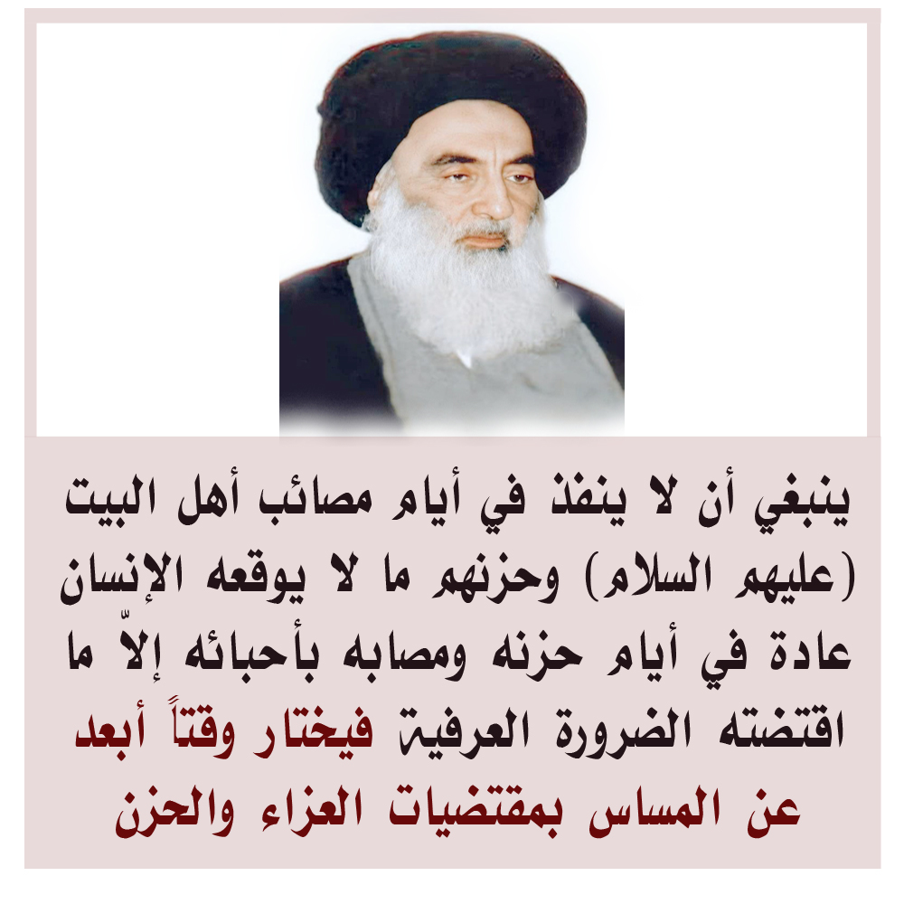 مواساة اهل البيت عليهم السلام : ينبغي أن لا ينفذ في أيام مصائب أهل البيت (عليهم السلام) وحزنهم ما لا يوقعه الإنسان عادة في أيام حزنه ومصابه بأحبائه إلاّ ما اقتضته الضرورة العرفية فيختار وقتاً أبعد عن المساس بمقتضيات العزاء والحزن