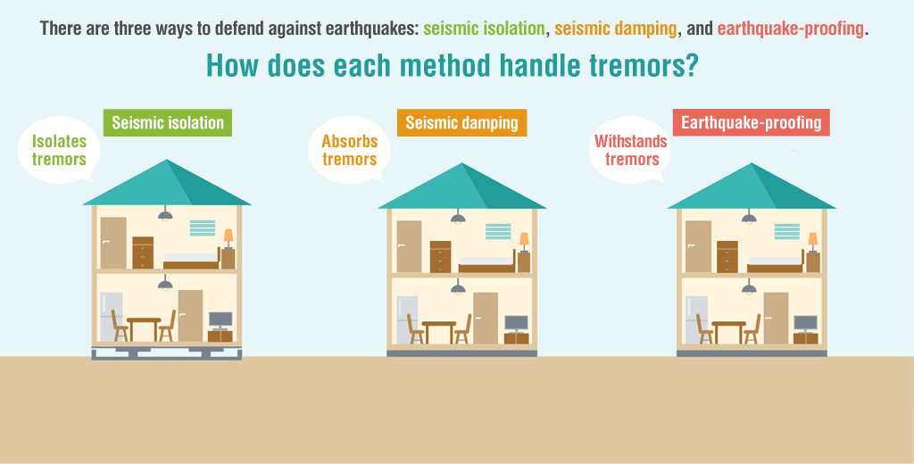 الصورة توضح ثلاثة أساليب لحماية المباني من الزلازل، كل منها يعتمد على مبدأ فيزيائي مختلف للتعامل مع اهتزازات الأرض. الأول هو العزل الزلزالي (Seismic isolation)، حيث يُوضع المبنى على قواعد مرنة تعزل الاهتزازات عن الهيكل، فتتجنب الأضرار. الثاني امتصاص الاهتزازات (Seismic damping)، الذي يستخدم مواد أو أجهزة تمتص الطاقة الزلزالية وتقلل حركة المبنى. الثالث التصميم المقاوم للزلازل (Earthquake-proofing)، حيث يُبنى المبنى ليحتمل مباشرة قوة الزلزال دون انهيار .