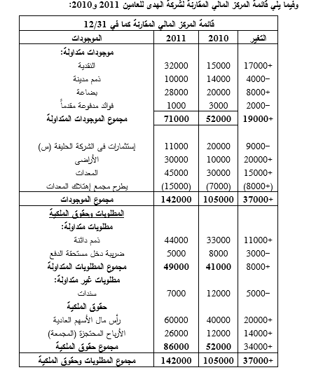 وقد تضمنت قائمة المركز المالي كما في 31/12 (المقارنة) لشركة التميز أرصدة الحسابات التالية :