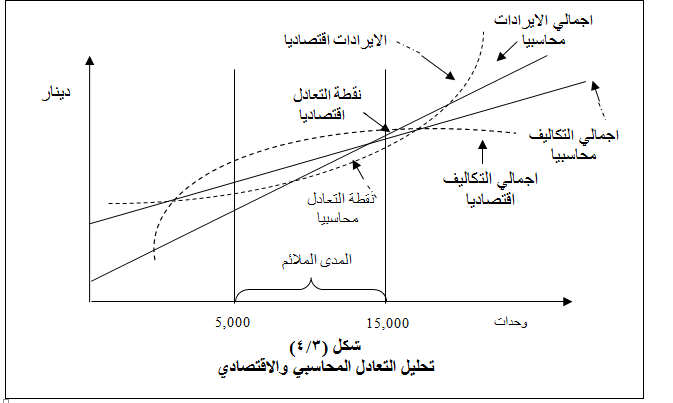 يوضح الشكل السابق أن التكلفة الكلية والإيراد الكلي قد مثلت بمنحنيات بدلا من خطوط مستقيمة كما في تحليل التعادل المحاسبي، حيث أنه كلما زادت الكمية المباعة، يزداد الإيراد أيضا، ويبدأ الإيراد في الازدياد فيما بعد بمعدلات منخفضة عما كان عليه الوضع من من قبل ، ويمكن تفسير ذلك بالحاجة إلى تخفيض سعر البيع كلما تم بيع وحدات أكثر، وبالنسبة للتكلفة الكلية فهي أكثر تعقيدا حيث تتزايد بمعدلات متزايدة في البداية، ثم تتزايد فيما بعد بمعدلات متناقصة (نتيجة لتزايد الغلة)، ثم تستمر في الازدياد ولكن بمعدلات متزايدة (لتناقص الغلة).