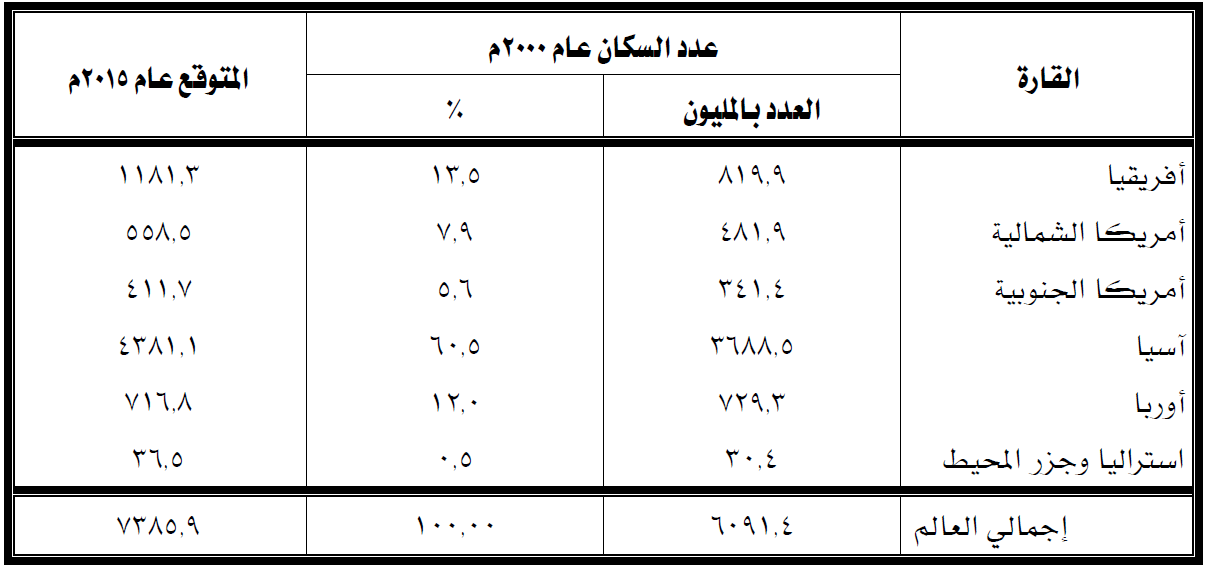 جدول عدد سكان العالم بالمليون عام 2000م والمتوقع عام 2015م