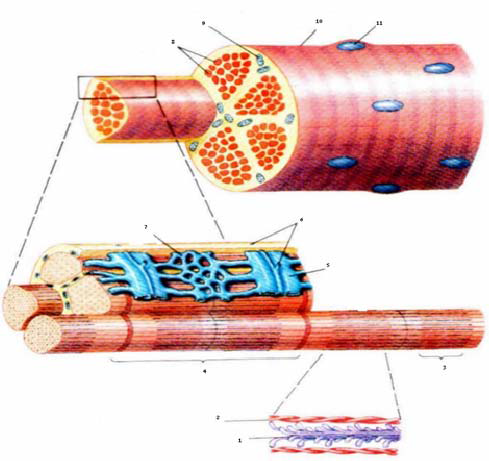 تركيب الليفة العضلية : 1- فيلم سميك من الميوسين ۲- فيلم رقيق من الاكتين 3- منطقة تداخل 4- سركومير 5- حوض النسيج الشبكي البروتوبلازمي 6- انابيب شكل T 7- نسيج شبكي بروتوبلازمي 8- لويفات عضلية 9- ميتاكوندريا 10- ليفة عضلية 11- نواة .