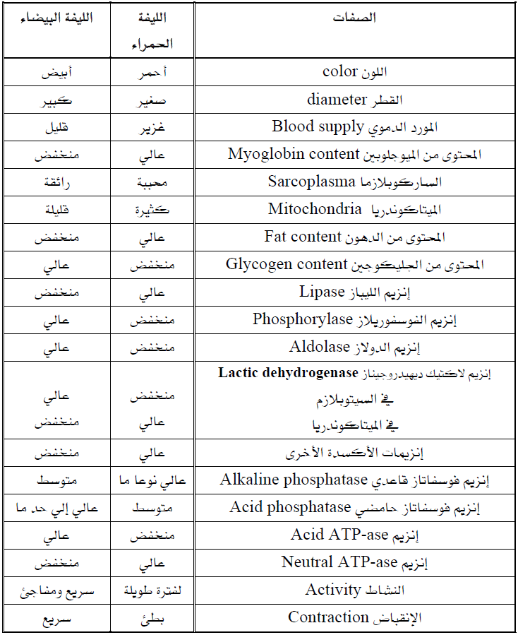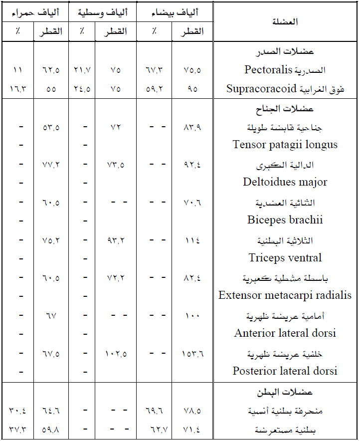 الجدول التالي يقارن بين أقطار الألياف العضلية من الثلاثة أنواع وهي البيضاء والحمراء والوسطية ونسبة وجودها في العضلات المختلفة لجسم الدجاج.
