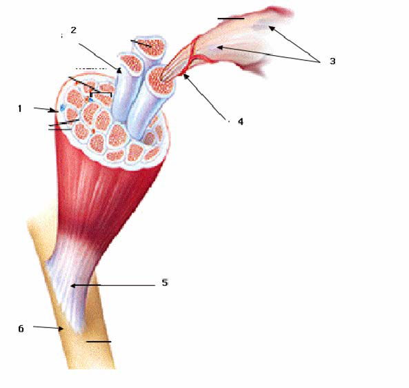 شكل يبين اتصال العضلة بالوتر واتصال الوتر بالعظم: 1- غمد العضلة 2- لفافة 3-انوية 4- ليفة عضلية 5 - الوتر 6- العظم.