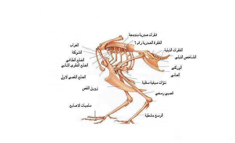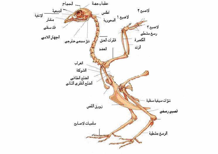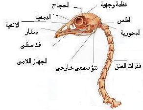شكل يبين عظام الطرف الامامي للدجاج والحزام الصدري والفقرات العنقية وعظام الجمجمة