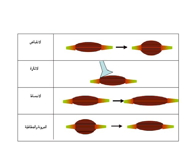 ومن المتطلبات الاساسية لقيام العضلة بوظيفتها هو قدرتها على الانقباض اي القصر في الطور ثم الارتخاء استجابة للتنبيهات العصبية الواردة اليها.