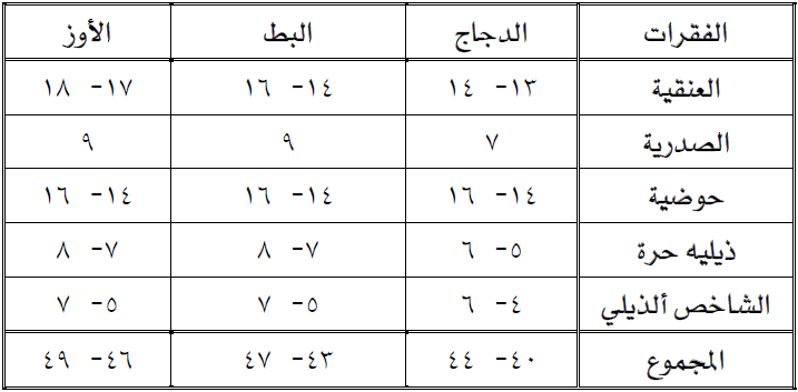 جدول يبين اقطار الالياف العضلية مقاسه بالميكرون من الانواع الثلاث البيضاء، الحمراء، الوسطية ونسبة تواجدها في العضلات المختلفة لجسم الدجاجة