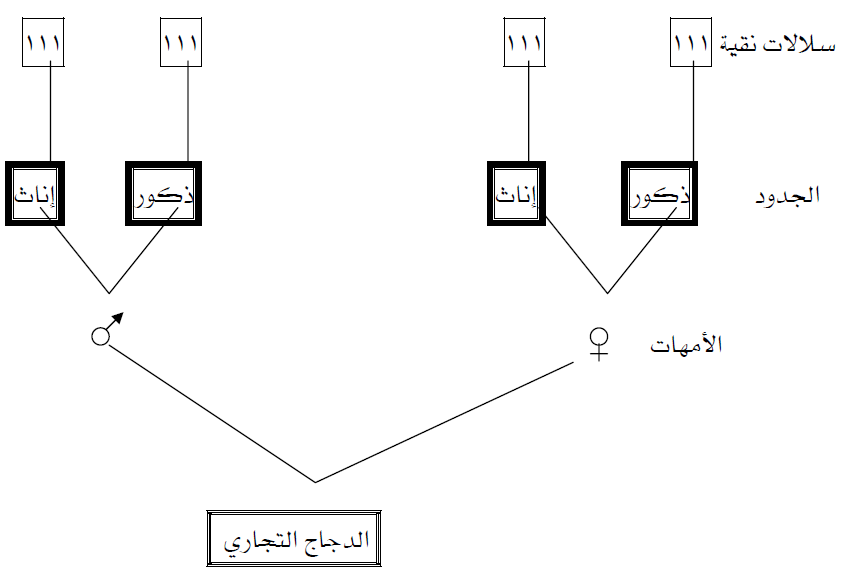 أي أن هناك أربعة خطوط في جيل الجدود (خطين لإنتاج الآباء وخطين لإنتاج الأمهات)، وخطين في جيل الوالدين (خط الآباء وخط الأمهات) ثم جيل بداري التسمين، وهو الهدف المطلوب الوصول إليه، وهو الجيل الذي يمكن للمربي العادي القيام بتربيته نظرا لأنه لا يحتاج إلى إمكانيات كثيرة، كما أن مشاكله تنتهي في مدة التربية القصيرة (لا تزيد عن 7 أسابيع) لأنه لا يحتاج إلى إمكانيات كثيرة، أما قطعان الأمهات أو الجدود أو الأصول فإنها تحتاج إلى إمكانيات كثيرة، وخبرة واسعة، نظرا لأن فترة التربية تمتد إلى حوالي سنة ونصف، كما أن كل دجاجة مسؤولة عن إنتاج حوالي مائة طائر من الجيل التالي، ولذلك يكون ثمن جيل الأمهات مرتفعة، وجيل الجدود أشد ارتفاعا، ولا يقدر على تربيتها إلا الشركات أو المزارع الكبيرة، أما أصول السلالات فتحتكر تربيتها الشركات العالمية المنتجة، وتعتبر سر من أسرارها.