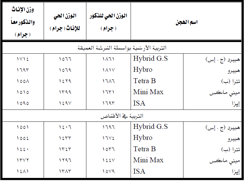 اهم الهجن المنتجة لدجاج اللحم والوزن الحي للذكور والاناث