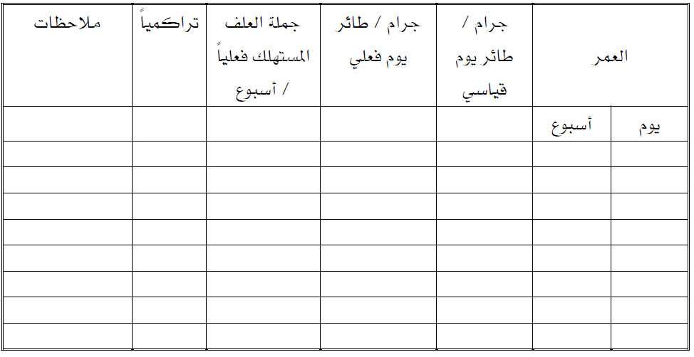 جدول رقم (7) نموذج لسجل يومي لمتابعة الصيصان