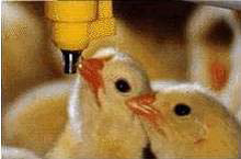 يتم نزع أو إزالة حوالي ثلث كل من المنقار العلوي والسفلي، ويجب أن يكون الفك العلوي متساويا في الطول مع الفك السفلي. كما أنه يترك مسافة 3ملم قبل فتحة الأنف في الإناث. كما يجب التأكد من أن هذه المناقير لا تنمو إلى حد يمكن أن تشكل خطورة على الدجاج عند عمر 18 أسبوع. حيث تتم إعادة عملية قص المنقار في الأفراد التي تنمو مناقيرها إلى هذا المستوى (شكل 15).