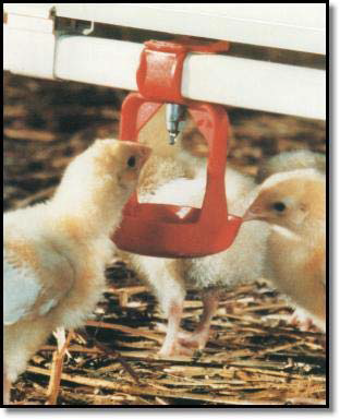 بالنسبة لسلالات إنتاج اللاحم إذا كان الماء مقدمة بواسطة المساقي الجرسية فإنه يخصص لكل ۸۰ طائر مشربية واحدة في الأجواء المعتدلة أما في الأجواء الحارة فيخصص لكل 60 طائر مشربية جرسية واحدة أما إذا كان الماء يقدم عند طريق الحلمات فإنه يخصص لكل حلمة عدد ۱۰ طيور وذلك في الأجواء المعتدلة أما في الجو الحار فيخصص حلمة لكل ۸ طيور أما بالنسبة لسلالات الدجاج البياض إذا كانت المساقي المستخدمة من نوع المشربيات المستديرة فيخصص لكل ۱۲۰طائر مشربية واحدة أما إذا كان المستخدم هو الحلمات فإنه يقدم لكل ۱۲۰ طائر حلمة واحدة . (شكل 11٬10٬۹٫۸).
