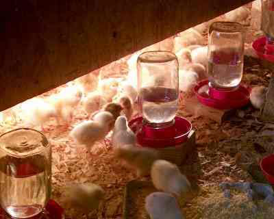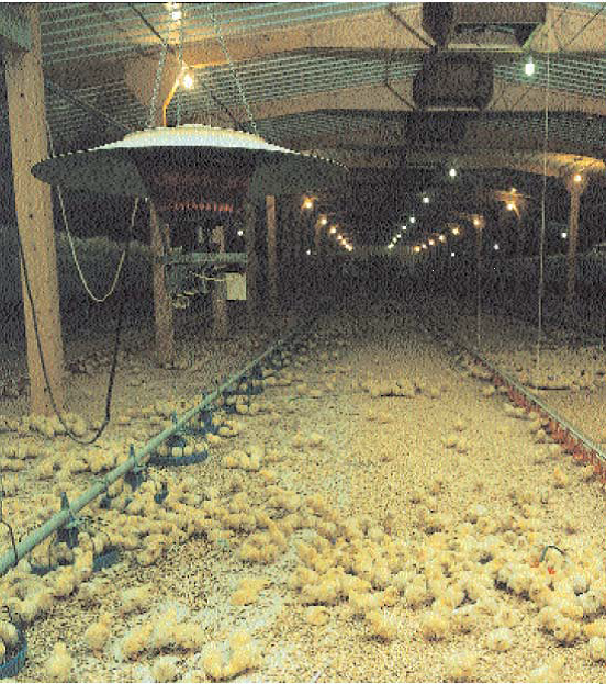 11) وفر أنوار، جذابة ( لجذب الطيور ) لإبقاء الصيصان قريبة من المصدر أو التدفئة ، كما يجب أن تكون كثافة تلك الإضاءة (20-60 لوكس) خلال الأسبوع الأول حتى يمكن للطيور الوصول إلى المعالف والمشارب بسهولة تامة (شكل 4).