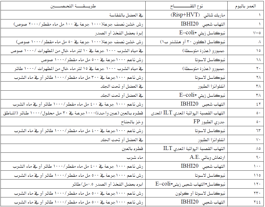 لذا لا يمكن وضع أي خطة محددة جامعة للتحصينات. الغرض الأساسي للتطعيم الأجود هو حماية الأمات من الأمراض وأعراضها وتوفير أجسام مضادة للأمراض للمواليد ( الصيصان ).