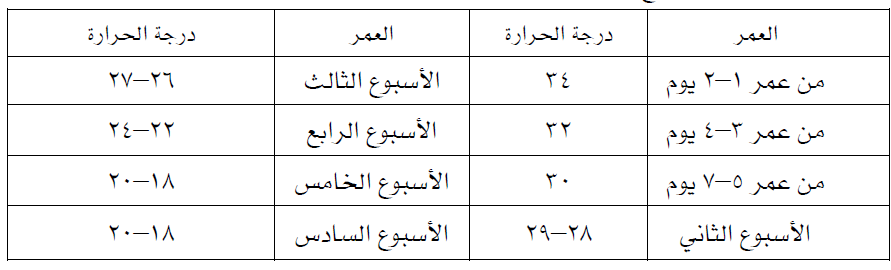 جدول (۲) يوضح متطلبات الصيصان من درجات الحرارة في مختلف الأعمار