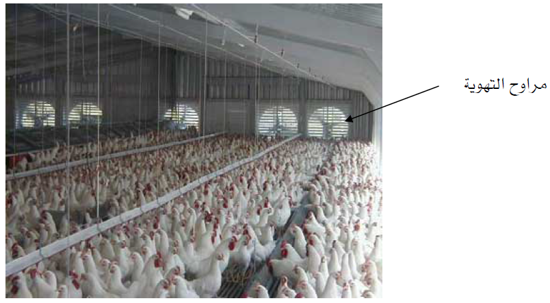 التهوية ضرورية فلا بد من توفير الهواء النقي في جو الحضانة لأنه يساعد كثيرا في تحسين النمو وحيوية الصيصان. لذا عند استعمال التهوية للتحكم في درجات الحرارة داخل العنابر تأكد من توفير الهواء الطلق داخل العنبر باستمرار شكل (19)، ويجب ان يلبي الهواء كل الاحتياجات التالية:
