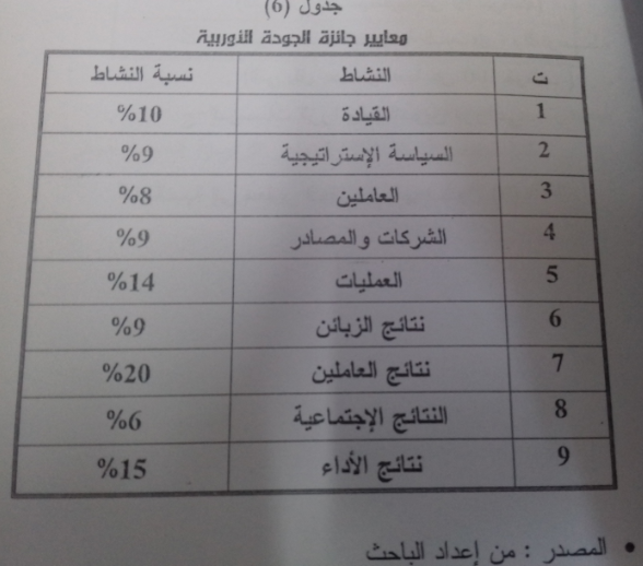 تأسست جائزة الجودة الاوربية عام 1988 وتسعى الجائزة إلى تحفيز ومساعدة المنظمات بكافة انحاء اوربا للمشاركة في أنشطة التحسين ولقيادة المنظمات لتحقيق رضا الزبون والعاملين وإدارة المعرفة والتأثير على نتائج العمل ولدعم المديرين في أوربا وبما يجعل إدارة الجودة الشاملة عامل حاسم للوصول إلى ميزة تنافسية عالمية ، ان معايير الجائزة الاوربية للجودة يوضحها الجدول (6) .