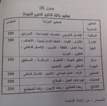لقد حددت مجموعة من المعايير لجائزة الخليج العربي للجودة الإدارية واليت يوضحها الجدول (8) .