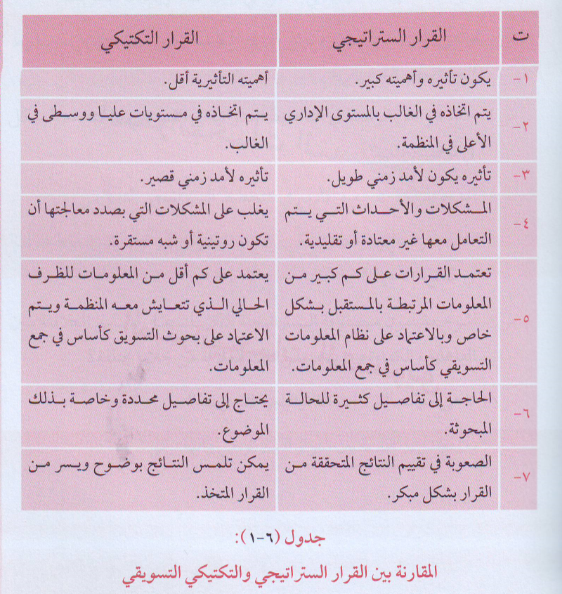 على الرغم من العلاقة المترابطة بين القرار الستراتيجي والتكتيكي في المجال التسويقي إلا أن ذلك لا يمنع من تأثير بعض الاختلافات للمقارنة ما بينهما وكما موضحة في الجدول (٦-١).
