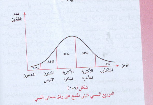 من جانب آخر فإن الحقيقة التي يجب أن تدركها المنظمة وتتعامل معها بشكل دقيق عند التخطيط لعملية تبني المنتج هي أن المشترون لا يتماثلون بذات الصفات والخصائص السلوكية في الشراء. بل أنهم تختلفون وبحسب نموذج منحنى التبني الموضح في الشكل (9-6) والذي يمكن تقسيمهم إلى خمسة مجاميع ومؤشر ايضاً توزيعهم النسبي حسب درجة عملية التبني وهم :