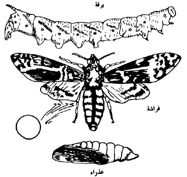يفقس البيض بعد نحو ۷۔۸ أيام ، ولليرقة 6 أعمار مددها على التوالي : 4.4 ، 3-6 ، 4-7 ، 6-8 ، 9-15 يوما وبهذا تكون مدة طور اليرقة كله نحو 30 - 45 يوما ، واليرقة لونها عند الفقس أبيض مصفر ثم يخضر بالتدريج حتى يصبح أخضر مشوبا بزرقة في اليرقة التامة النمو، ويوجد على رأس اليرقة خطان أسودان ، كما يوجد قرن شرجي محبب أسود اللون على الحلقة البطنية الثامنة وتبلغ اليرقة التامة النمو نحو ۱۲ سم في الطول، وعند اكتمال نموها تحفر اليرقات في التربة مستعملة أجزاء فمها وأرجلها وتعذر على عمق ۸۔ ۱۰ سم. والعذراء بنية اللون وتبلغ نحو 6-5 سم في الطول وخرطومها ملتصق بجسمها، ويستمر طور العذراء نحو 21- 46 يوما حسب درجة الحرارة. وتعيش الفراشة نحو ۷۔۱۲ يوما وتبلغ النسبة الجنسية ۱ - ۱. ولهذه الحشرة جيلان في السنة وعذارى الجيل الثاني هي التي تدخل بياتها الشتوي طول فترة الشتاء لتخرج منها الفراشات في مايو ويونيو التاليين وتتكرر دورة الحياة.