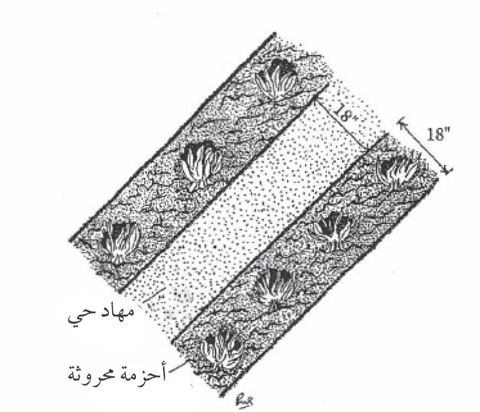 الشكل 3 حراثة أحزمة بمناطق مزروعة بعرض 18 بوصة للزراعة وللمهاد الحي بين المناطق المزروعة.